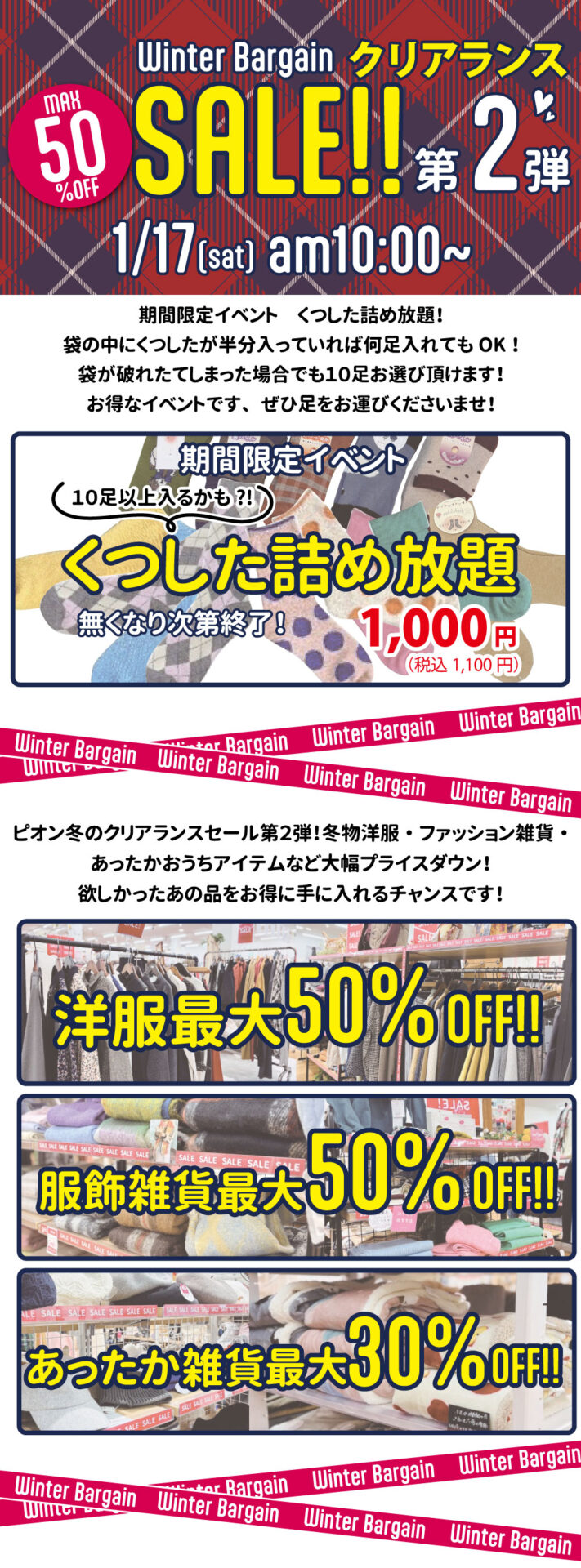ピオンクリアランスセール第2弾!くつした詰め放題ほか盛りだくさん!