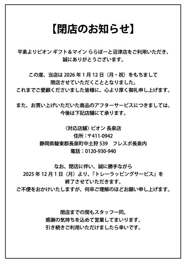 pion Gift&mine 閉店のお知らせ